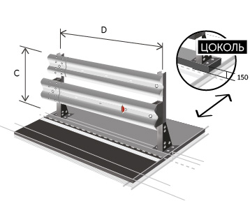 Одностороннее двухъярусное мостовое ограждение барьерного типа 21МО/450-1,1х1,5С1(4)-W(3)/W(3)-0,86(0,95), вторая группа удерживающей способности, высота ограждения 1.1 метра с шагом стоек 1,5 метра. Имеет двухволновой профиль и С-образную стойку. Ограждение препятствует выезду транспортных средств за боковые границы мостов, так же разделяет проезжую часть от тротуара.