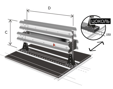 Двухстороннее двухъярусное мостовое ограждение барьерного типа 21МДЦ/450-1,1х1,5С1(4)-W(3)/W(3)-0,68(0,91), вторая группа удерживающей способности, высота ограждения 1,1 метра с шагом стоек 1,5 метра. Имеет двухволновой профиль и С-образную стойку. Ограждение препятствует выезду транспортных средств за границы мостов, так же разделяет проезжую часть.